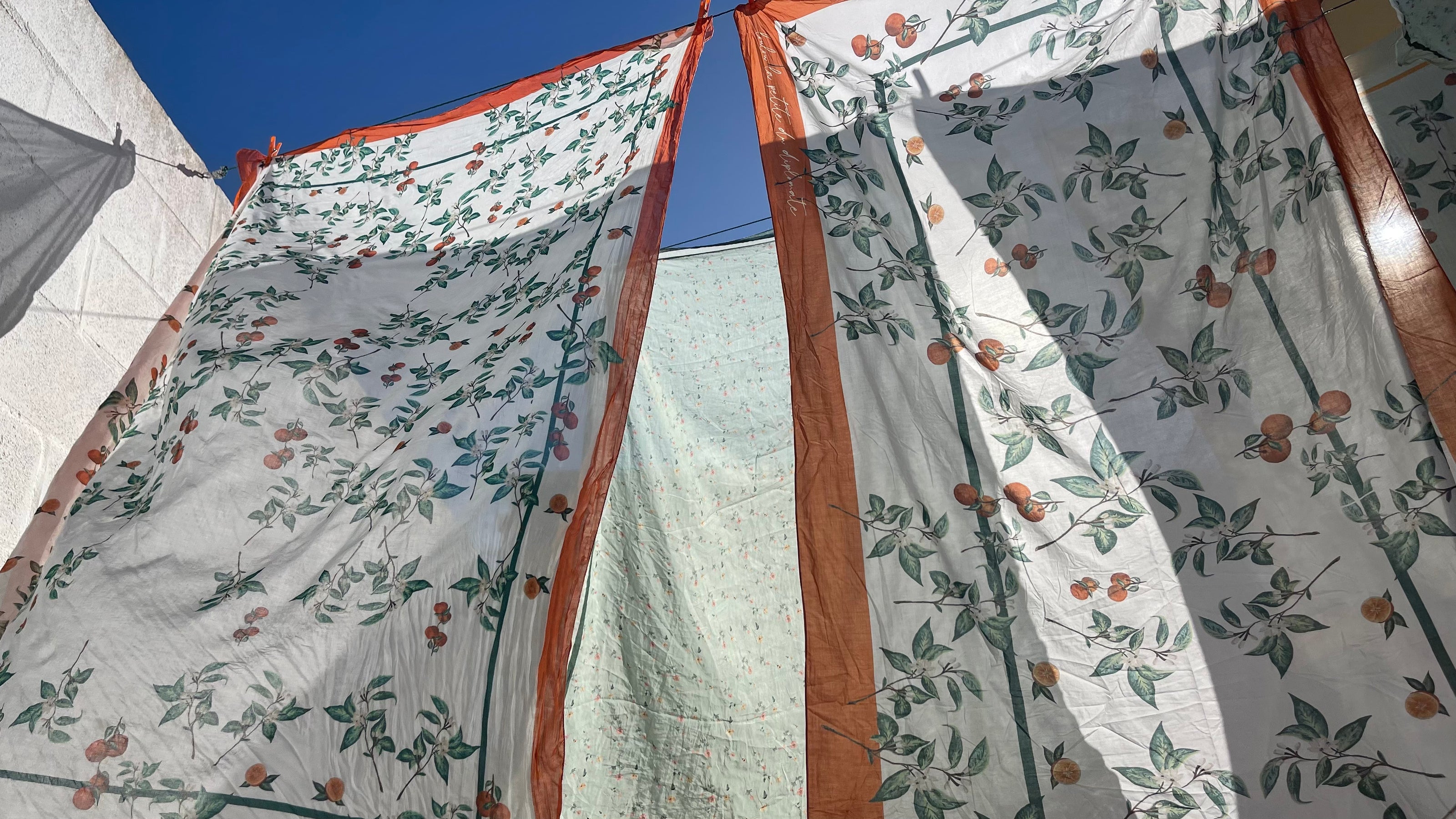 El proceso de fabricación es manual. Pintamos los diseños a mano con acuarelas. Para después estamparlos en tejidos naturales y orgánicos. Para la estampación, hemos optado por un pequeño Atelier familiar. Cosemos a mano usando la técnica de enrollar para después dar pequeñas puntadas.