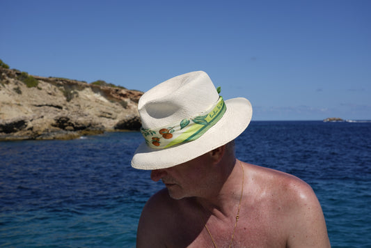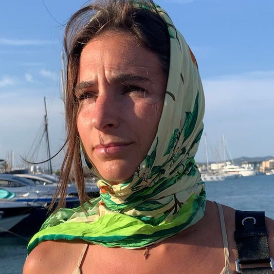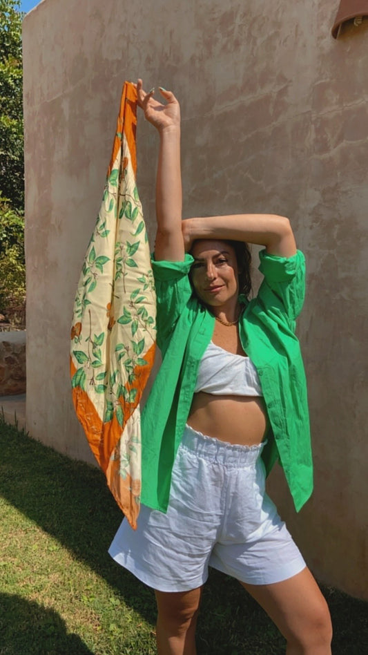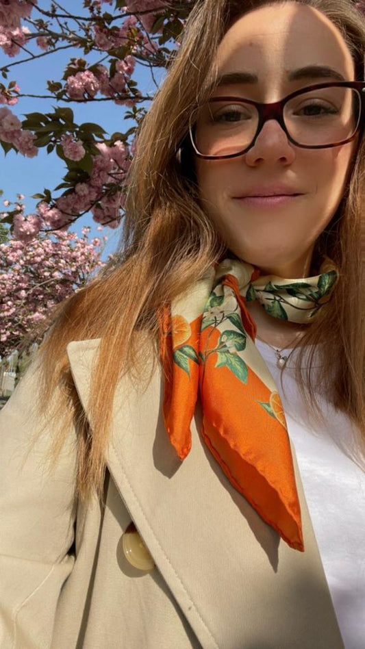 Pañuelo de Seda Beige con ramita de Naranjas y Flores (90 cm x 90 cm)