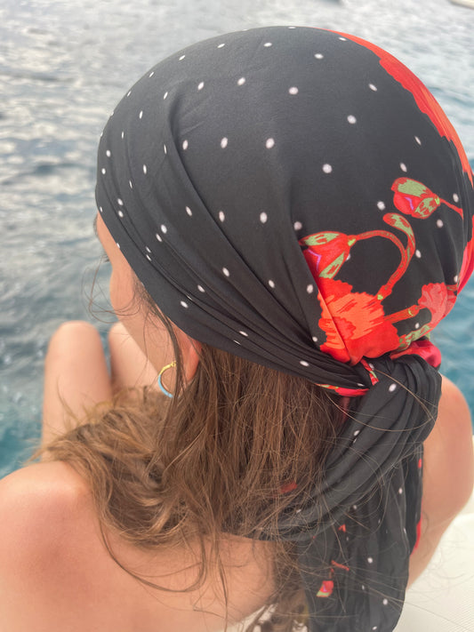 Pañuelo de Seda Negra con lunares blancos y Flores Rojas (90 cm x 90 cm)